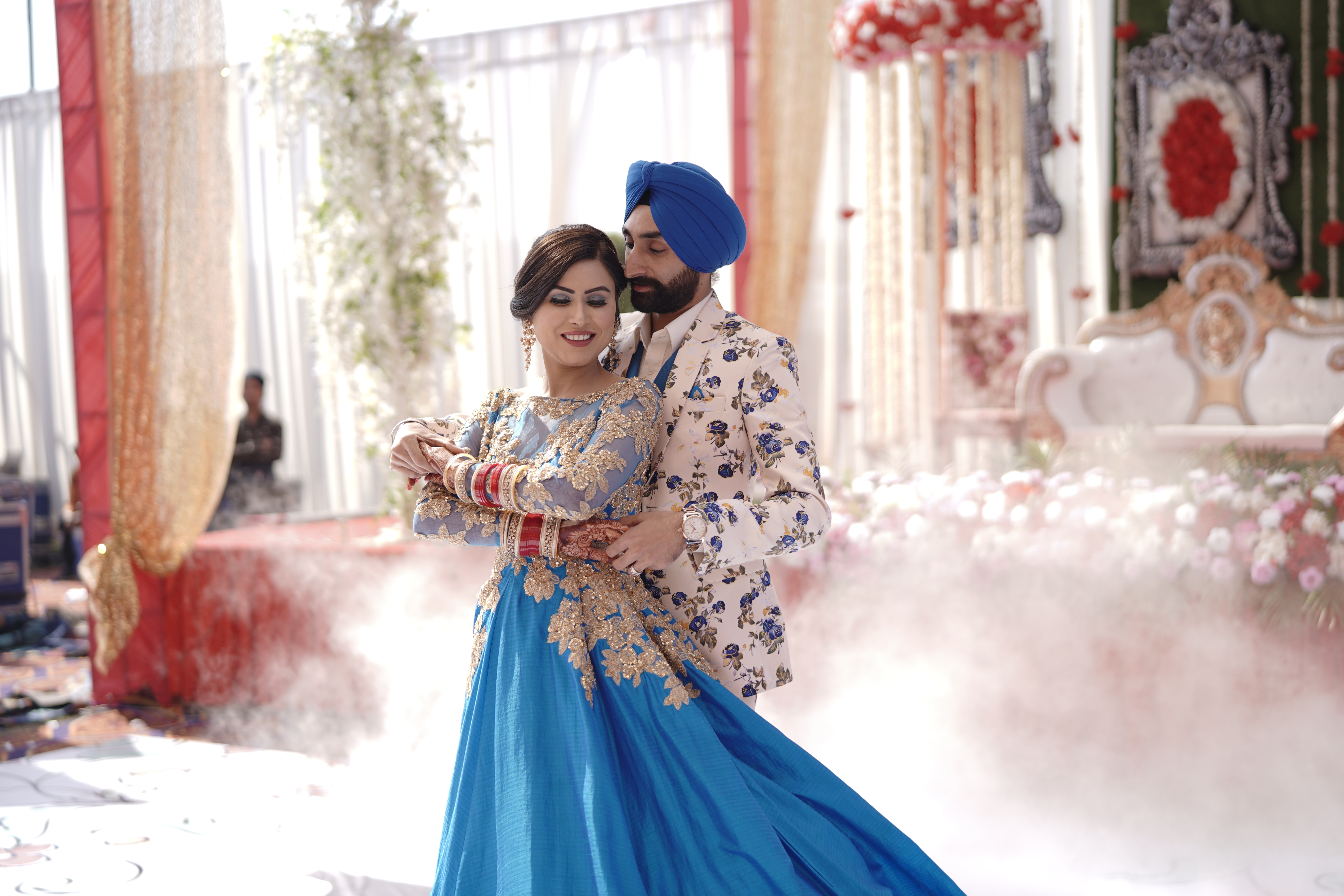 The Dream Wedding, Sara had always wanted the wedding to be very vibrant, loud, loads of dancing, and be the dhinchak bride without any stress. They enjoyed and remembered every single moment of their wedding. From having pain puri on their wedding to enjoying the pack of lays while getting ready. Hardy always wanted a very organized and punctual wedding so that the guests and he himself would have more time to enjoy the wedding. He also wanted the wedding to be very royal grand big in decors, flowers, stage, artistic, colorful, and personal touches. Since him being a bhangra lover no one could stop him from shaking his leg. All the colors that they selected represented, how much they love colors and didn’t want to stick to the basics.