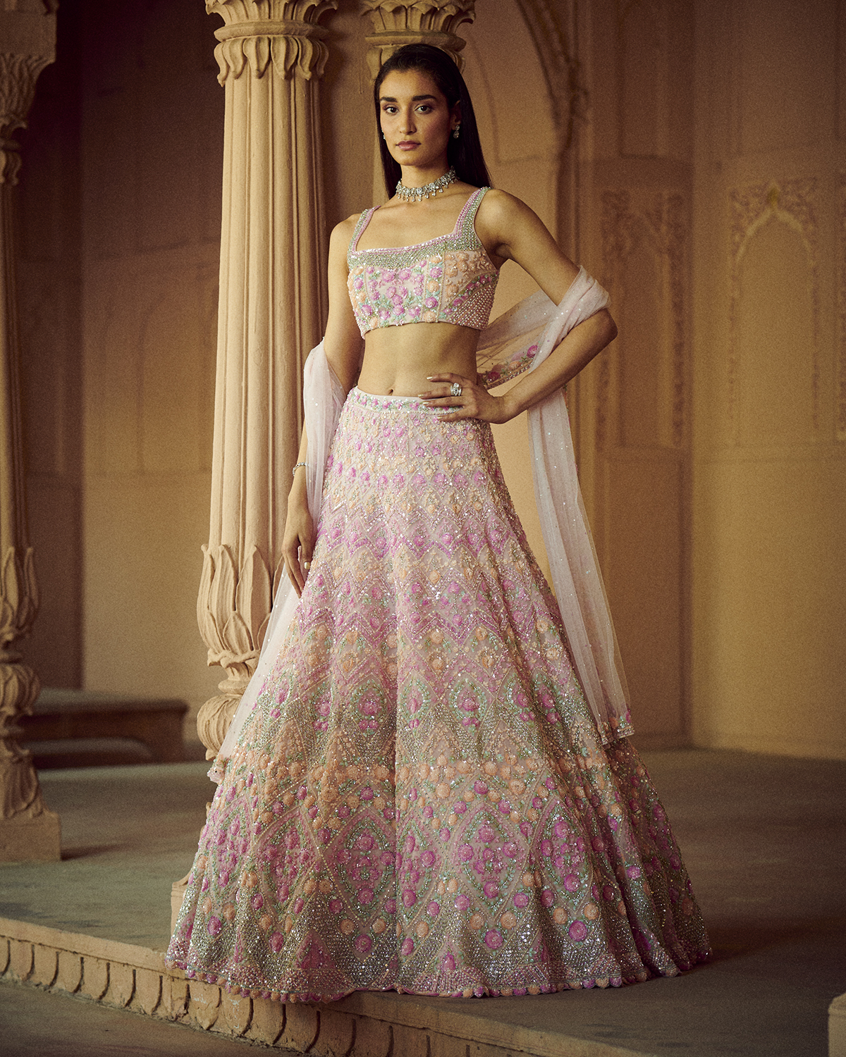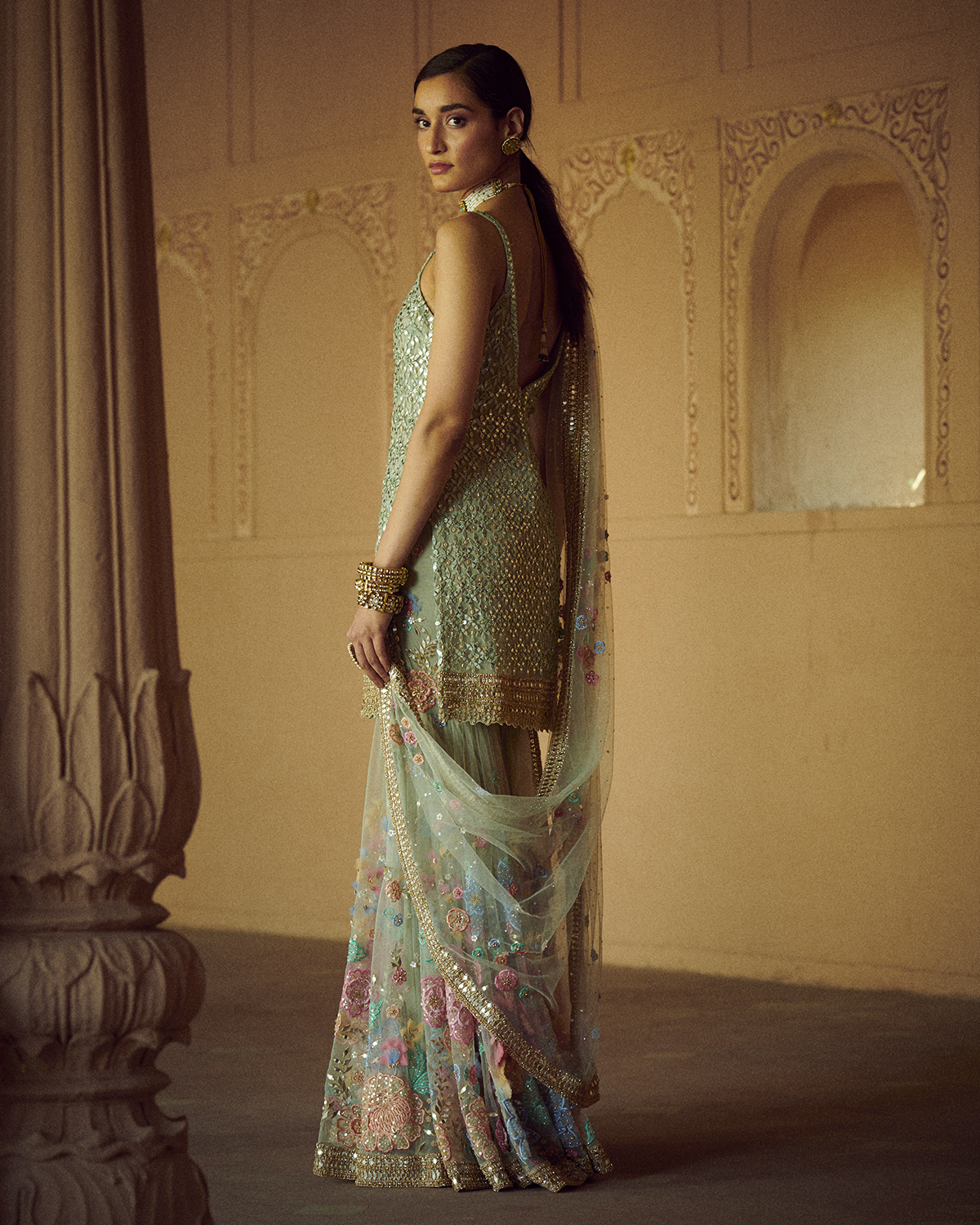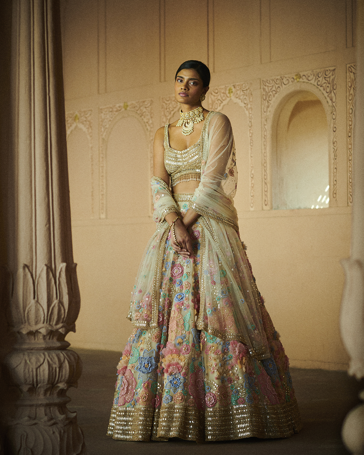 ‘Portraits’ as a collection follows the delicately evolving phases of Maharanis, where time moved but the craftsmanship was such that each piece remained timeless. With two design forms, Ghararas and Lehengas, it is the subtle detailing that makes each piece unique. The three-dimensional floral embroideries using varied fabrics, embroidery materials, and a combination of various embroidery techniques along with traditional Rajasthani mirror work and soft multicolored sequins is the signature for this collection. The garments are elegantly created with pride and passion as reflected in the fine craftsmanship of intricate embroideries, gotta Patti, and mirror work. The color palette is an eclectic mix of softer hues for the day occasions such as ivory, beige, yellow and deep mustards, rusts, and reds for the night. Then there is the light rose gold gotta Patti work heavily accentuated with pearls and crystals to create a glamorous silhouette that works for occasions that span through the day. The collection also features trending elements like double dupattas and embroidered belts which bring the modern element to essentially traditional Indian festive wear. The colors are celebratory, from the crystals to the sequins to the mirror work, each piece is handwoven, hand studded like true artisanal pieces should be.