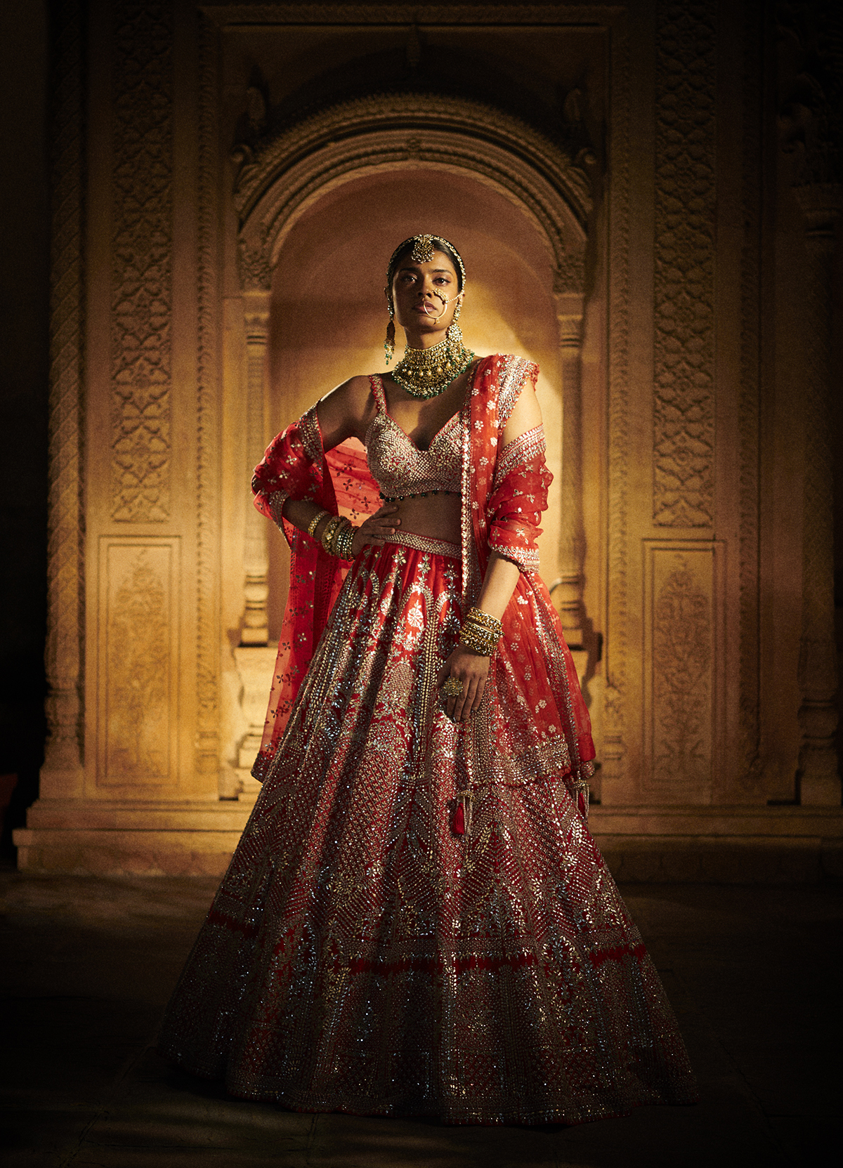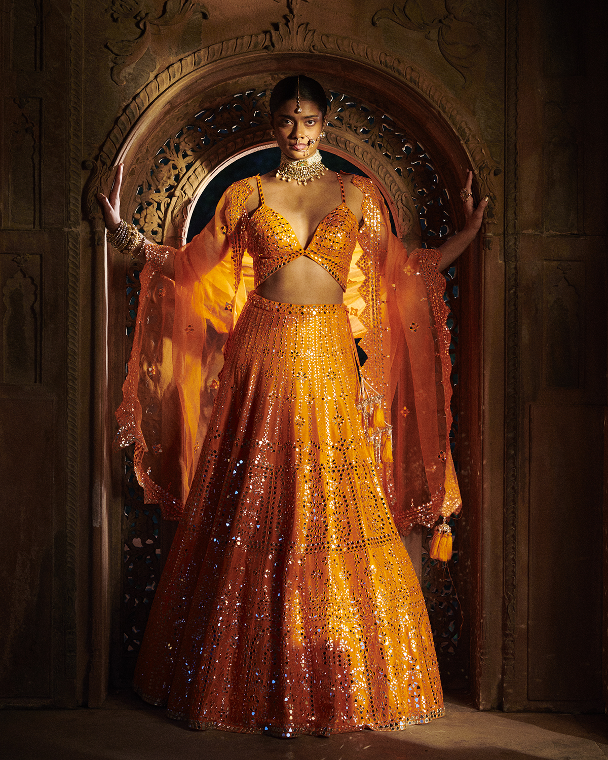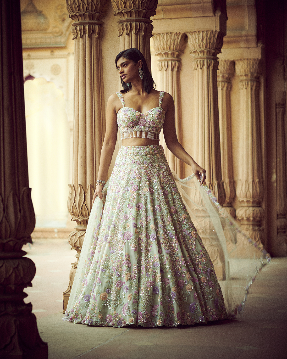 ‘Portraits’ as a collection follows the delicately evolving phases of Maharanis, where time moved but the craftsmanship was such that each piece remained timeless. With two design forms, Ghararas and Lehengas, it is the subtle detailing that makes each piece unique. The three-dimensional floral embroideries using varied fabrics, embroidery materials, and a combination of various embroidery techniques along with traditional Rajasthani mirror work and soft multicolored sequins is the signature for this collection. The garments are elegantly created with pride and passion as reflected in the fine craftsmanship of intricate embroideries, gotta Patti, and mirror work. The color palette is an eclectic mix of softer hues for the day occasions such as ivory, beige, yellow and deep mustards, rusts, and reds for the night. Then there is the light rose gold gotta Patti work heavily accentuated with pearls and crystals to create a glamorous silhouette that works for occasions that span through the day. The collection also features trending elements like double dupattas and embroidered belts which bring the modern element to essentially traditional Indian festive wear. The colors are celebratory, from the crystals to the sequins to the mirror work, each piece is handwoven, hand studded like true artisanal pieces should be.