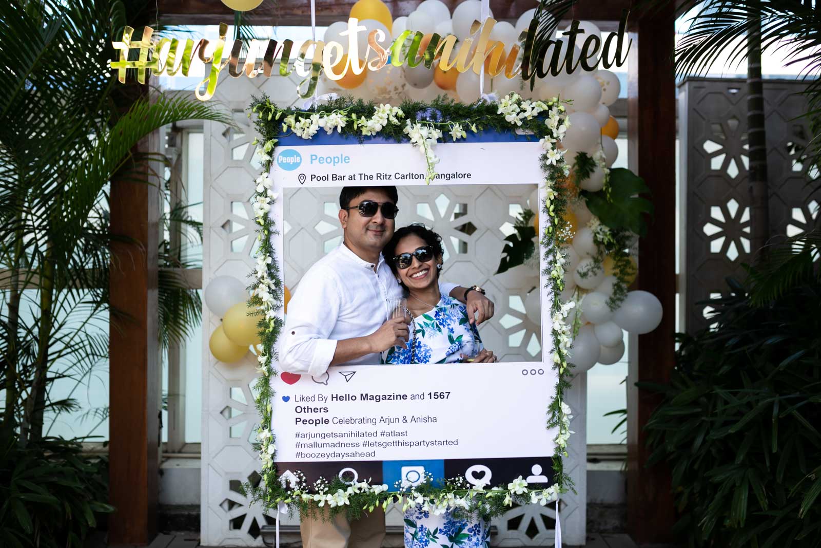 Beauty lies in details. The traditional Christian wedding of Anisha and Arjun was turned into a mesmerizing Countryside wedding with the right amount of rawness and modern decor. The wedding was an elaborate celebration of the union of the couple with planned pre and post wedding events. The pre-wedding Cocktail Party at Ritz Carlton, hosted by the bride’s sister was a Tropical delight! The venue was covered in greenery with summer elements like coconuts being used creatively for flower arrangements. Fun elements like photo frames with personalized hashtags and photobooth made it an Instagram friendly event. It was a perfect Sun downer party with the correct sunlight of Jan.