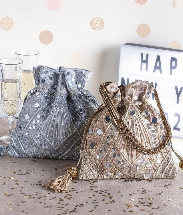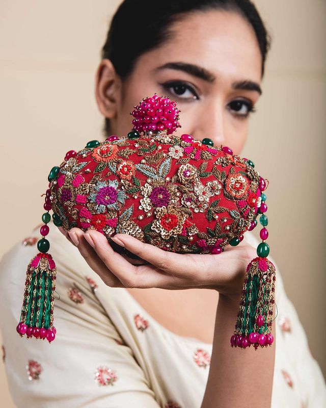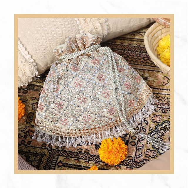 Their bags designed will leave spellbound by its color options and the designs inspired by traditional motifs. Also these potlis are handy and beautiful to choose for wedding to pair it well with wedding outfit.