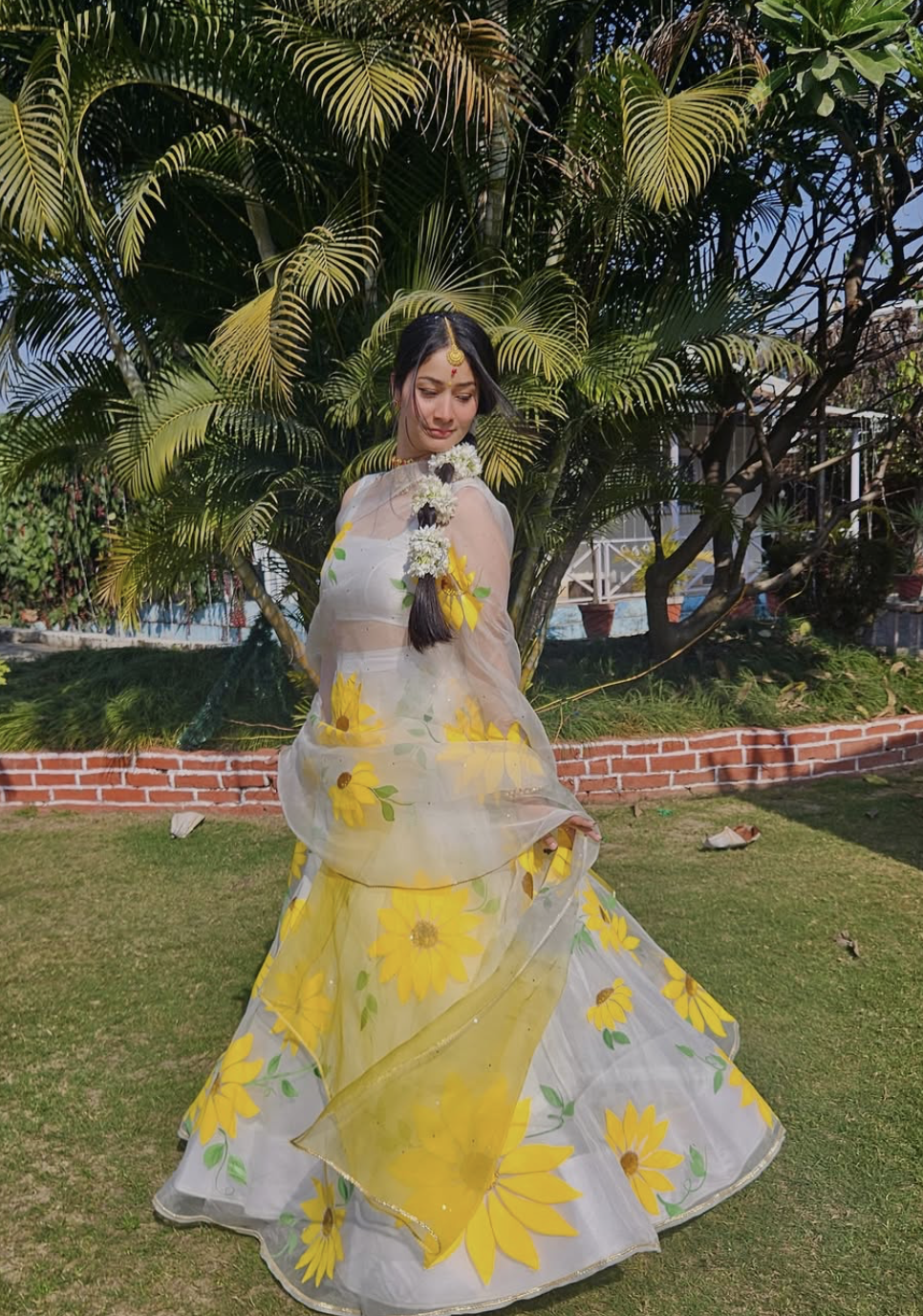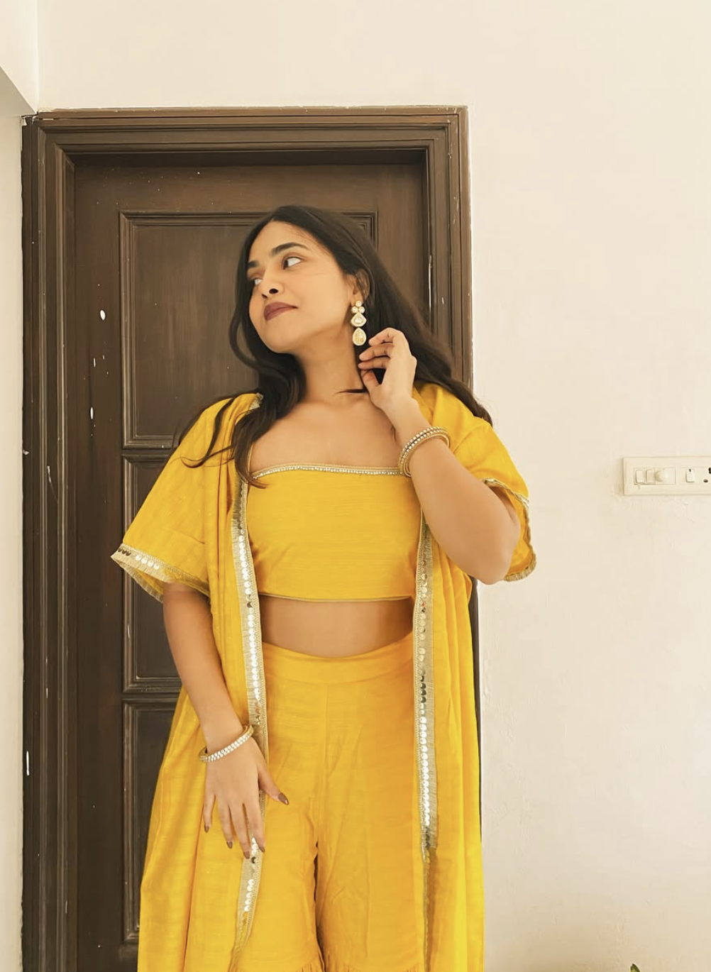 Modern Indian wear with flowy fabrics, happy colours, and minimalist charm, ideal for outdoor Haldi vibes.