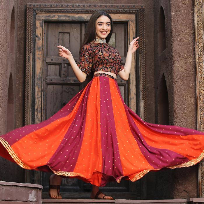 Indian festivals and traditional functions are ruled maroon. Rust is the new entrant in the list of festive colours. Here we have a vibrant Maroon and Rust Polka & Jaal Festive Lehenga Crop Top Set for you to saunter through the gala events. Made with breathable viscose in vivid print, the outfit is a sure head-turner. The outfit looks elegant with a pair of dangling earrings and bracelets. High heels will complete the look, and you might as well drape a dupatta to add to the oomph of it.