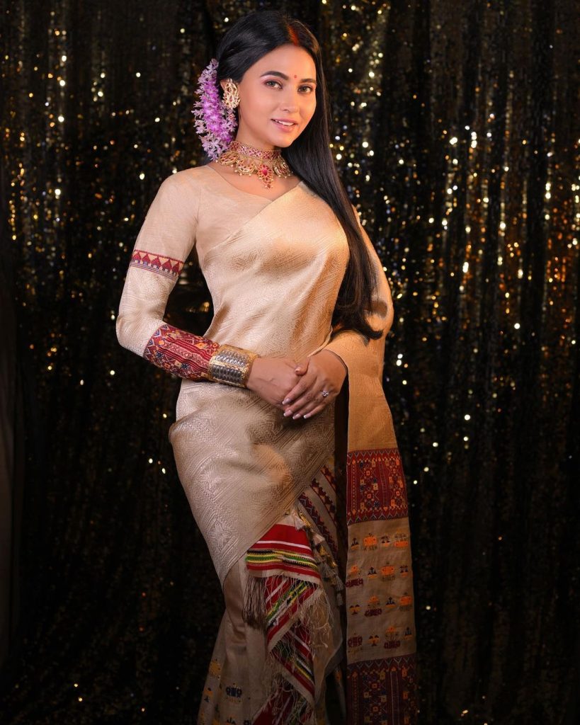 Assamese star Aimee Baruah made a bold cultural statement with her muga silk mekhela sador, adorned with ancient Assamese motifs like Goj Bota and Gam Kharu. Her outfit, designed by Juthika By Momita, beautifully showcased her heritage and left a lasting impression on the red carpet.