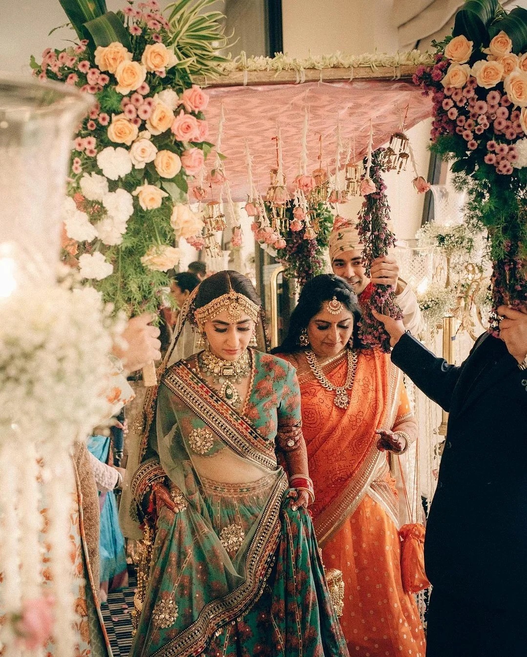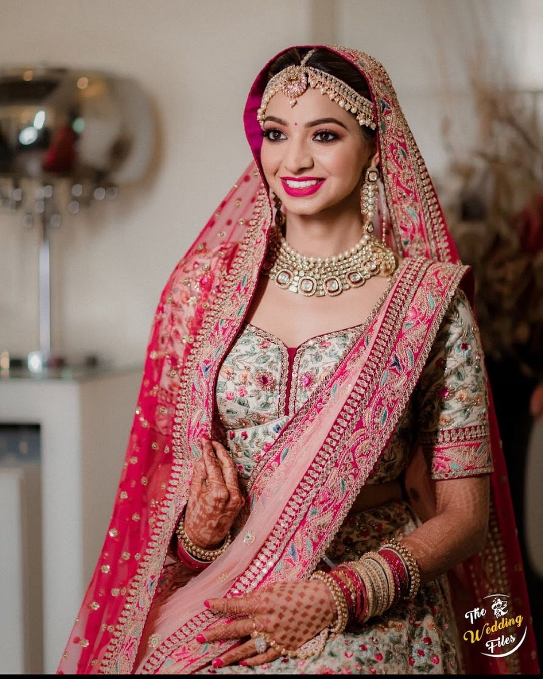 Bride has styled contrasting colored dupattas where the front one is sleekly pleated and draped like a saree and the other is over the head.