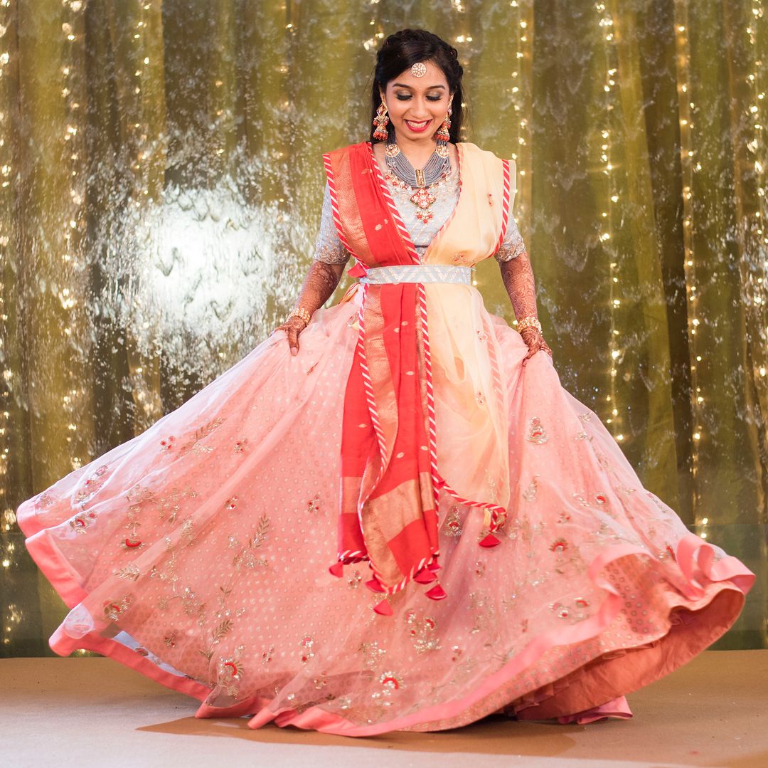 This draping style definitely gives a wholesome look to your wedding day outfit. The front dupatta is pined on the shoulder from one end and is left all open with the other side draped at the back. You can adjust the length and fitting as per your wish and comfort.