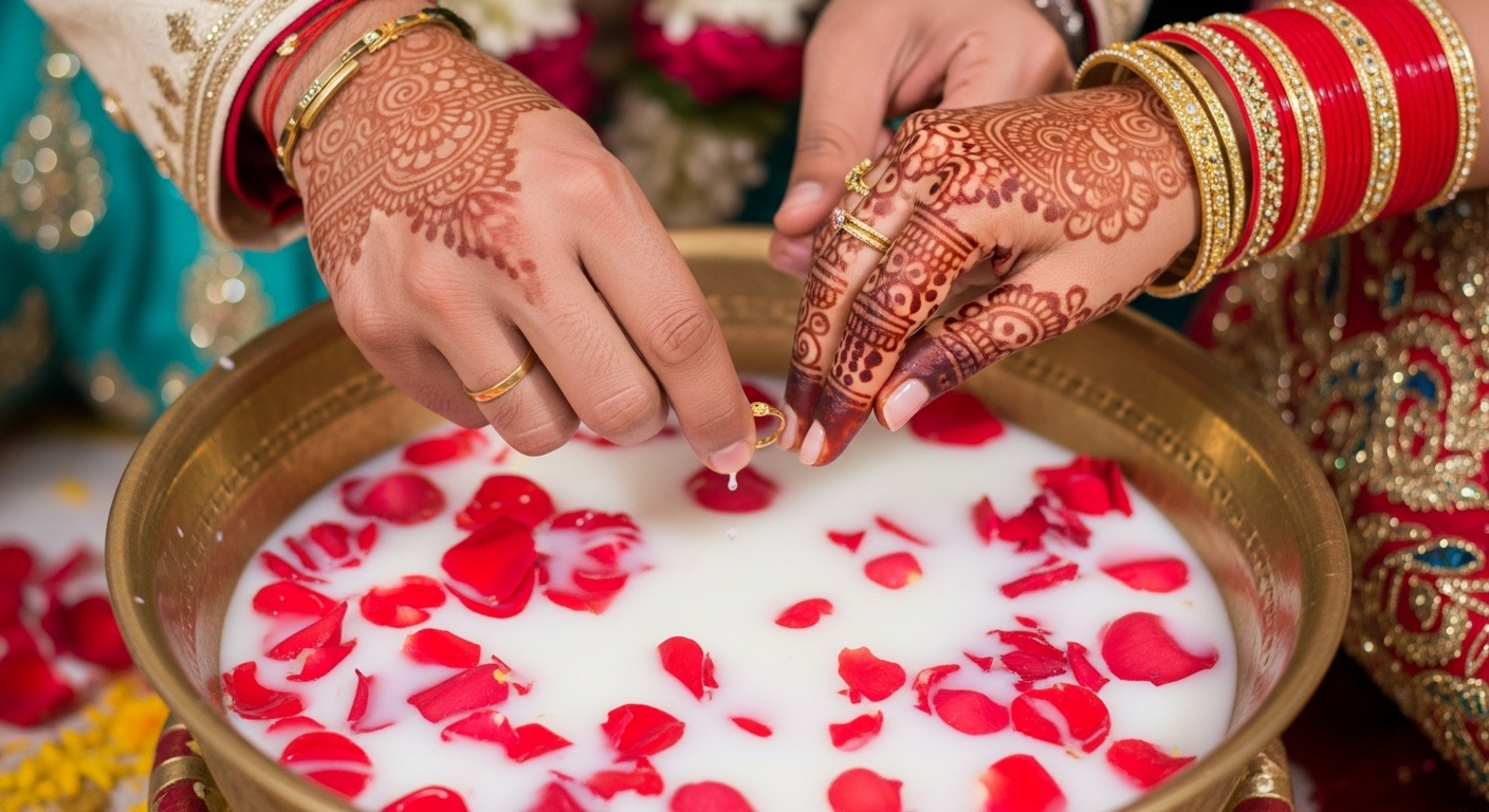 In some weddings, the ring-fishing game—where the bride and groom dip their hands into a bowl of milk or water to find a hidden ring—sparks laughter as guests cheer them on. Even regional traditions, such as post-wedding games or veil-pulling pranks, add a fun spin to otherwise solemn occasions.