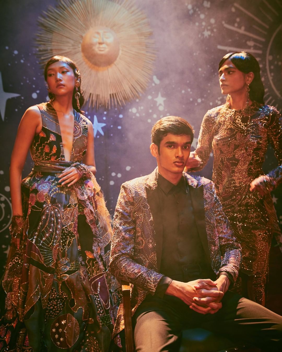 The collection is inspired by the moon rising in the heavens above with pulsing beams of radiant moonlight to waken and transform the world. Crafted using the legendary and complex Jamdani weaving technique and its innovative diversity, the ensembles represent the magical creations woven from Dhaka, Benaras, Kota, Srikakulam, Uppada, Venkatgiri, Kashmir & Paithan.