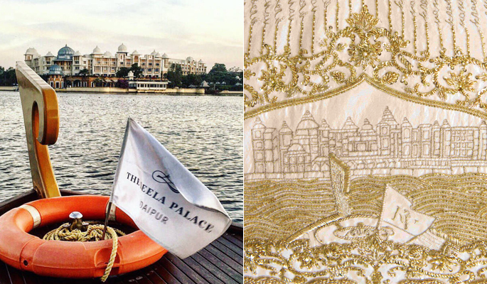 The Leela Palace, Udaipur carved beautifully on the lehenga, where the duo tied the knot.