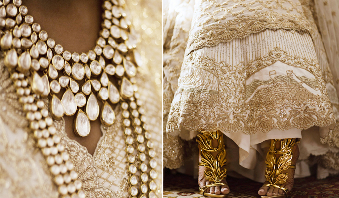 She wore the jewellery which was designed by her husband Vanraj Zaveri who comes from a background of renowned jewelers. The other image captures the hem of the lehenga having jumping dolphins which is depicting the time when they first met to work on a project against Dolphin Captivity.