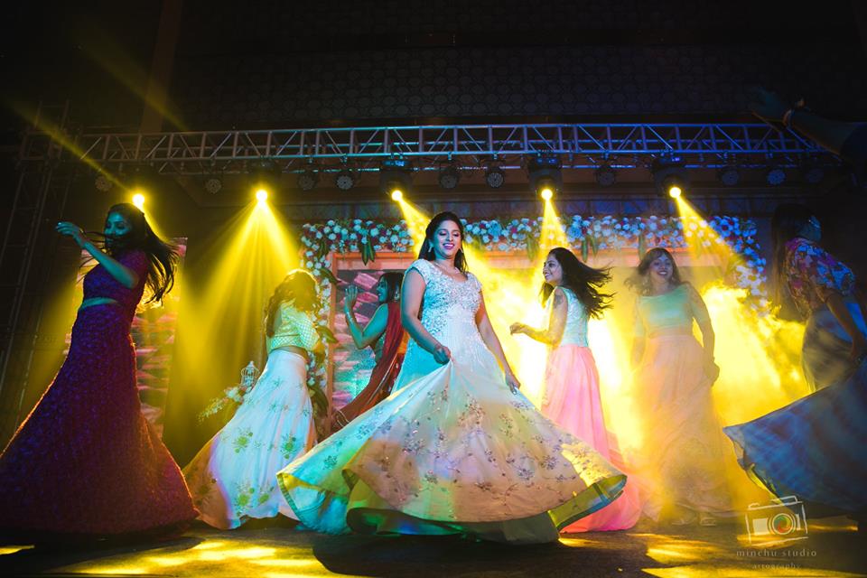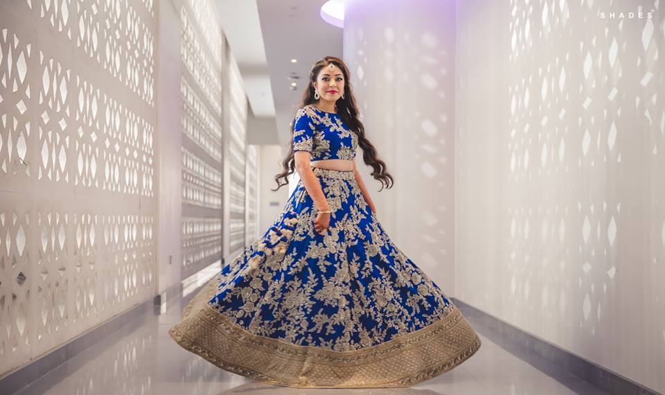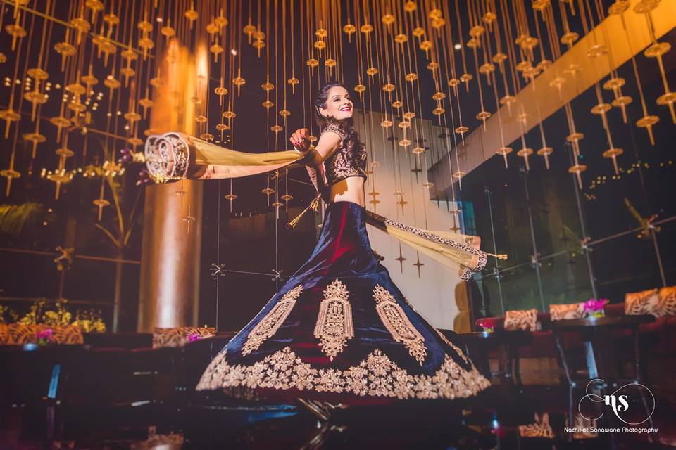These days we can see the brides wearing vibrant colors, beautiful designs, going by the theme and don’t even shy away from using props and giving that western touch to their sangeet outfit.