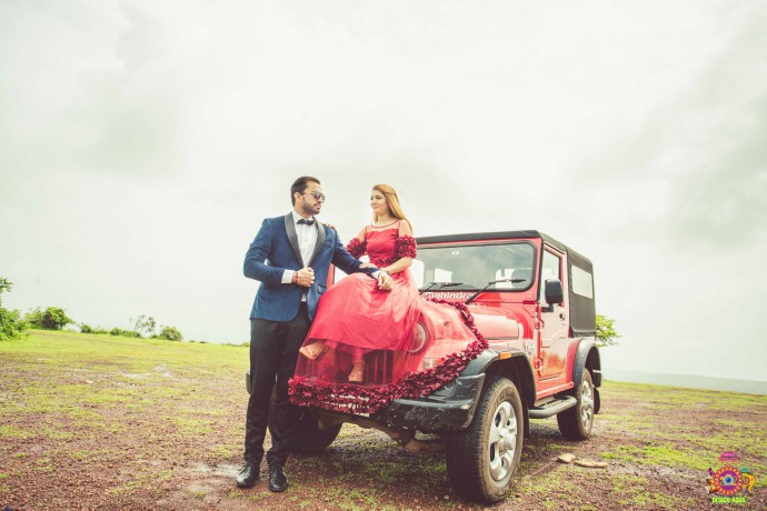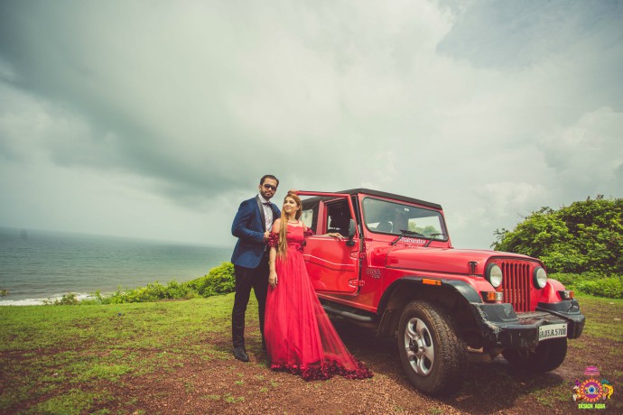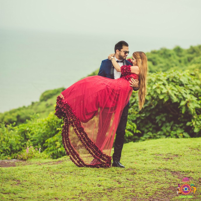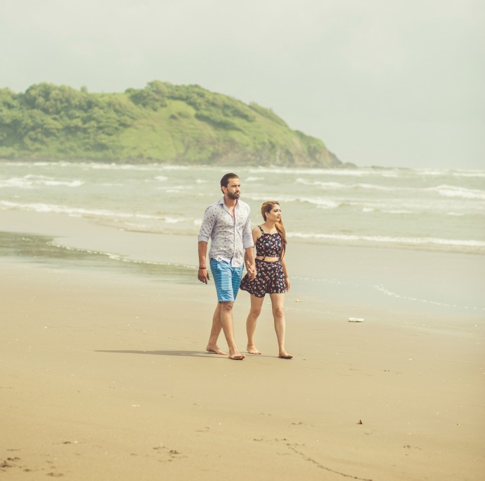 I didn’t have any plans to do my pre wedding until I found a concept. My clients, future brides, followers always kept on asking how it would be & what would I do. Suddenly I had this idea that since I am a photographer, why not shoot it myself?! So along with my team we flew to Goa. I didnt want to do wear all fancy clothes and do what I make my other couples do – I just wanted to have fun! I did wear a gown for one of the looks but the rest of the pre wedding was shot we being ourselves.