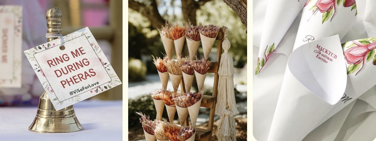 For that perfect floral exit, petal cones filled with rose petals or confetti can be beautifully branded and handed to guests before the ceremony ends.