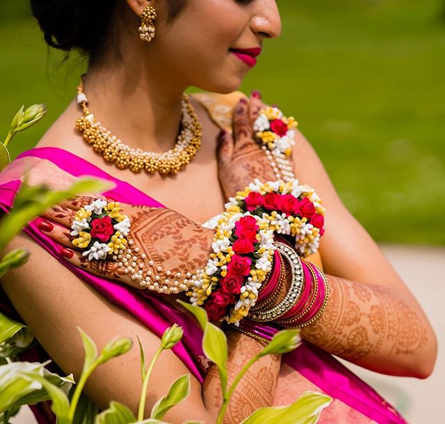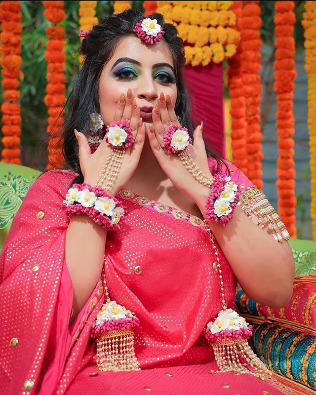 Flowers are the integral part of wedding as they are used in decoration & for jewelry as well. The importance of flowers in wedding are felt very closely and why not, the kind of beauty or fragrance that it holds can full your moments as well as life with those fragrance whole life. Floral jewellery are in trend as they are light weighted and look so pretty, soothing to our eyes. Looking stand out on her wedding is every bride’s dream and floral jewelry are the best option. Floral kaleere are all time favourite and loved to be used while brides walk down her aisle. Similarly Floral kadas have gain so much popularity and are in trend also making it most used jewelry now a days for its different and unique look. Flowers and floral jewelry add exquisite beauty to match up with your outfit. They are specially wore by brides in mehandi or haldi functions.