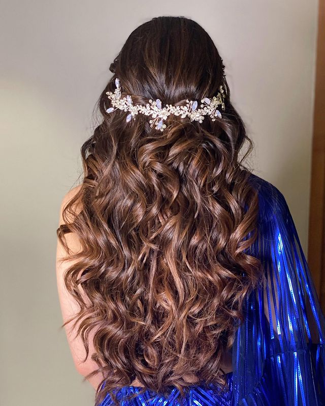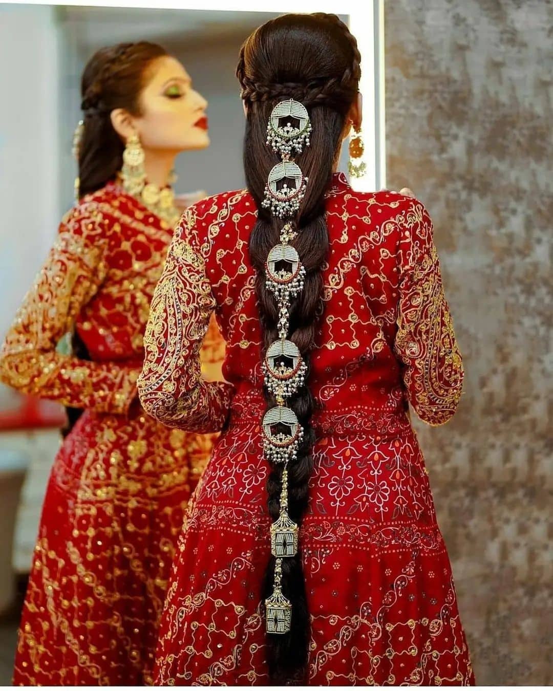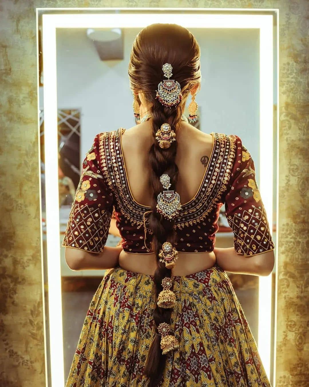 Going for a neatly done plait or leaving it loose, one can decorate it with a chain of heavily